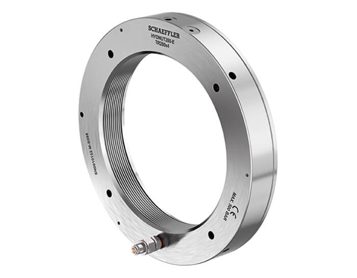 Las tuercas hidráulicas Schaeffler se utilizan para montar rodamientos con roscas métricas o trapezoidales en piezas de trabajo. Los rodamientos se pueden montar directamente en un eje cónico, en un adaptador