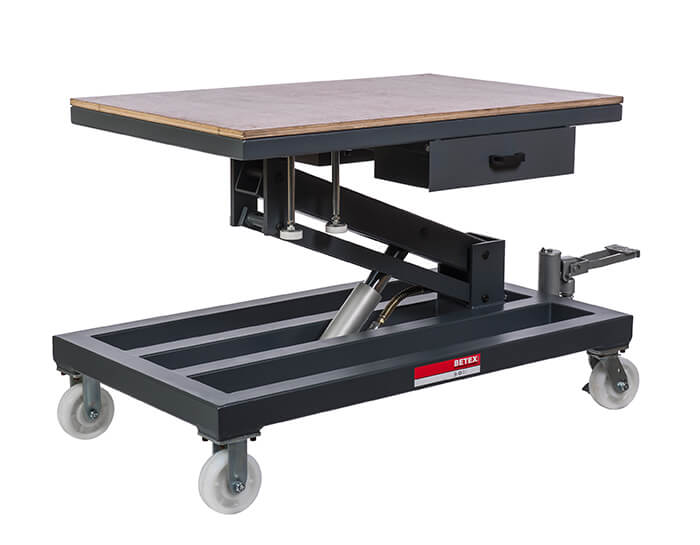 De Betex Mobilift is een modern geconstrueerde hydraulische heftafel met uniek één-armig hefprincipe. De tafel is verrijdbaar en toch stabiel. Door toepassing van een hydraulische pomp heeft u geen last van kabels over de werkvloer. Al deze eigenschappen maken de Mobilift zeer geliefd in werkplaatsen en is - na kennismaking ermee - niet meer weg te denken.