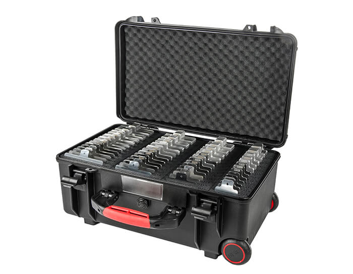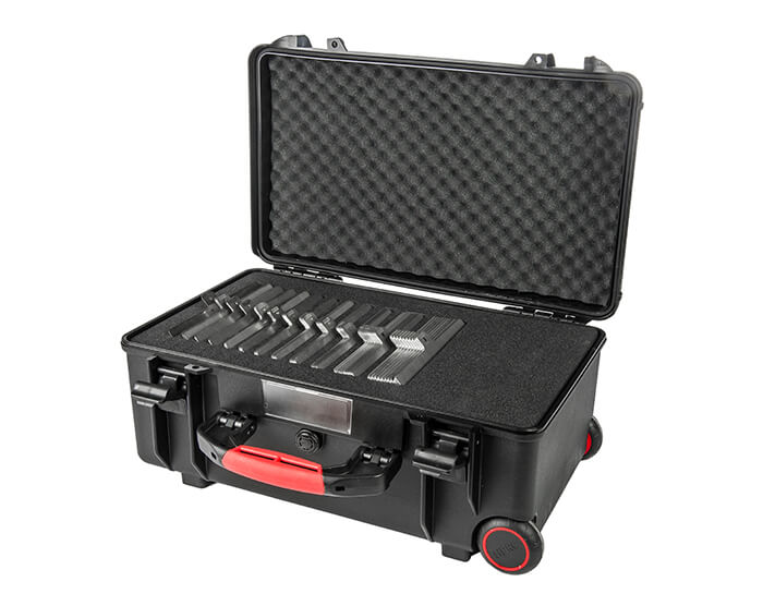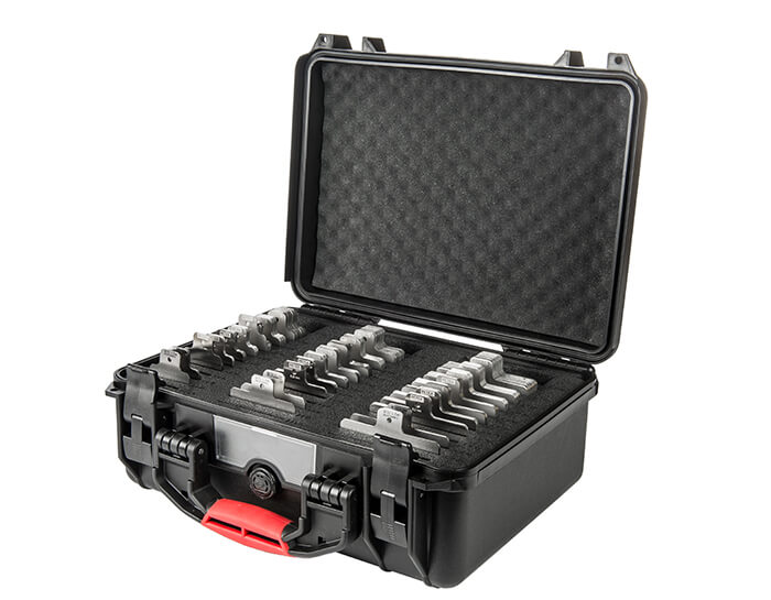 - Er zijn 3 verschillende type koffers: ABC, ABCD en E, deze kunnen worden afgevuld met verschillende vulplaten in 24 standaard combinaties.